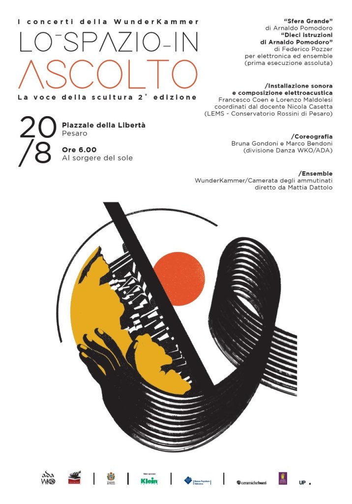 Sabato 20 agosto alle 6.00 del mattino (accesso libero) in Piazzale della Libertà a Pesaro torna con un suggestivo appuntamento al sorgere del sole “LO SPAZIO IN ASCOLTO. La voce della scultura”, progetto pluriennale di WunderKammer Orchestra (WKO) e Archivio Loreno Sguanci, che pone l’attenzione sulle opere d’arte en plein air che arricchiscono la geografia culturale della città. L’iniziativa ha il patrocinio del Comune di Pesaro, Assessorato alla Bellezza, il contributo di Sistemi Klein (main sponsor), Banca Popolare Valconca, e la collaborazione di Ceramiche Bucci, Giardino di Santa Maria, UP Studio.