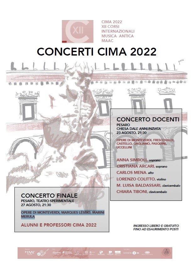 A chiudere gli appuntamenti aperti alla cittadinanza è il concerto finale, in programma al Teatro Sperimentale, sabato 27 agosto, alle ore 21:30 durante il quale si esibiranno alunni e professori del CIMA 2022 nelle opere di Monteverdi, Marques Lésbio, Marini e Merula.