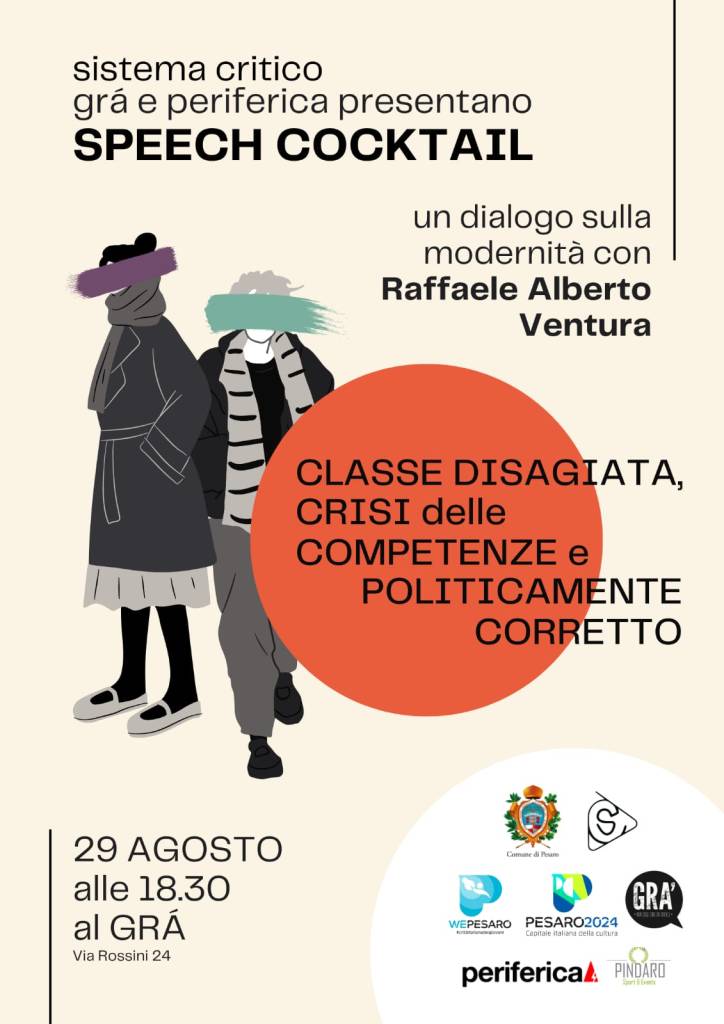 “Classe disagiata, crisi delle competenze e politicamente corretto: un dialogo sulla modernità con Raffaele Alberto Ventura” è il titolo dello “speech cocktail” in programma lunedì 29 agosto, alle 18:30, al Gra’ di via Rossini 24, promosso da Pesaro, “Città Italiana dei Giovani 2022” e organizzato da Sistema Critico e Periferica, in collaborazione con Gra’ e Pindaro.