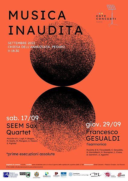 Giovedì 29 settembre (ore 18.30) Francesco Gesualdi guida il pubblico in un viaggio nella fisarmonica del passato e del presente con un programma in cui vengono magistralmente rappresentate le composizioni e l’arte dei grandi Girolamo Frescobaldi e Carlo Gesualdo, accostati, per una certa analogia da scoprire, alle composizioni di autori della musica d’oggi (Mauro Montalbetti, Howard Skempton, Laurence Crane, Antonio Agostini). Ad impreziosire il tutto, in programma anche la prima esecuzione assoluta di Sand, brano del 2021 del compositore pesarese Danilo Comitini, commissionato dall’Ente Concerti di Pesaro proprio per la nuova edizione di Musica Inaudita.