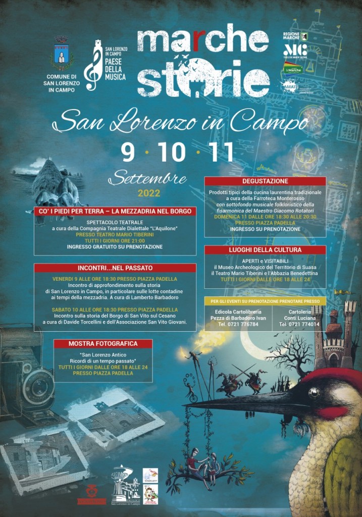 Cultura, teatro, arte, fotografia: l’amministrazione comunale di San Lorenzo in Campo partecipa quest’anno al Festival MArCHESTORIE, promosso dalla Regione Marche, con un ricco e variegato programma. L’evento, che nasce per raccontare le Marche attraverso i suoi borghi, i suoi sapori, la sua vicenda millenaria ma soprattutto le sue storie, si terrà nel cuore del centro storico il 9, 10, 11 settembre. «Siamo molto felici – spiega l’assessore Martina Feduzi, che ha curato il programma – che il nostro progetto sia stato ritenuto meritevole dalla Regione. Abbiamo ideato, grazie alla collaborazione di associazioni locali, che ringraziamo, un programma che permetterà di accendere i riflettori, attraverso diverse iniziative, sulla nostra storia locale, le tradizioni laurentine, il dialetto. Tre giornate ricche di appuntamenti, interessanti per tutta la comunità ma anche per chi verrà a trovarci da fuori». Soddisfatto il sindaco Davide Dellonti: «E’ fondamentale conoscere il passato per capire il presente e costruire il futuro. Il Festival MArCHESTORIE in tal senso offre un’opportunità straordinaria e noi siamo molto contenti di partecipare per regalare ai laurentini e non solo un week-end di festa ma anche culturale».