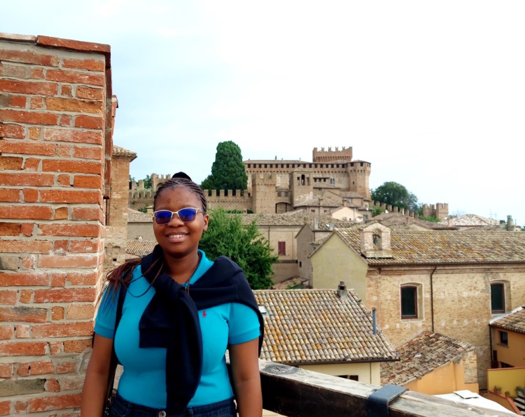 GRADARA – Giovedì 15 settembre è stata ospite del Comune di Gradara, la giovane studentessa universitaria Rebecca Kagabo di Johannesburg, che ha avuto modo di ammirare anche i territori malatestiani e Ravenna (a cura del Centro internazionale di Studi Francesca da Rimini e di APT Emilia Romagna). Insieme al primo cittadino Filippo Gasperi e alle guide turistiche Francesca Giommi e Monia Magalotti, e la professoressa Lorenza Bonifazi, ha visitato e ripercorso i luoghi legati al mito di Paolo e Francesca, ovvero la Rocca di Gradara e la Camera di Francesca e Fiorenzuola di Focara, citata nel XXVIII Canto dell’Inferno.