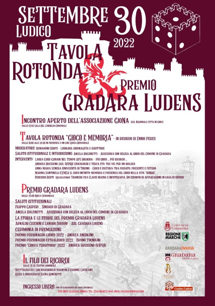 La giornata gradarese del 30 settembre sarà interamente dedicata al gioco. Alle 12 si terrà infatti una assemblea a porte aperte di GioNa, l’“Associazione Nazionale delle Città in Gioco”, cui seguirà, alle 16, una tavola rotonda su “Gioco e Memoria” in onore di Ennio Peres (interverranno: Federico Berti, Andrea Dresseno, Laura Guidi, Marco Peres, Marina Santinelli, Susanna Serafini, Beniamino Sidoti, Anna Maria Venera). Alle 20 si terrà la cerimonia di premiazione, cui seguirà, alle 21,30 nel teatro comunale, “Il filo dei ricordi”, spettacolo di e con Marcogiulio Magnani e Corinne Catalano.