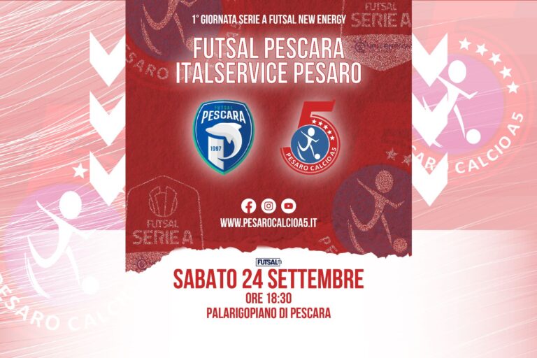 PESARO – Ci siamo, finalmente comincia una nuova stagione. L’Italservice Pesaro sabato debutta in campionato, in quella Serie A vinta giusto pochi mesi fa per la terza volta consecutiva. Si parte col botto, con un classico che ha sempre entusiasmato gli appassionati del calcio a 5 tricolore. La squadra di mister Fulvio Colini fa visita al Futsal Pescara, al PalaRigopiano, con start previsto alle ore 18,30.