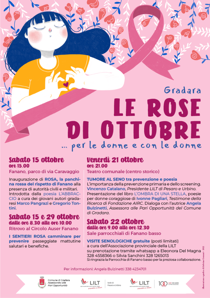 L’Assessorato alle Pari Opportunità del Comune di Gradara terrà alta l’attenzione sul tema della prevenzione attraverso l’iniziativa LE ROSE DI OTTOBRE … PER LE DONNE E CON LE DONNE che raccoglie una serie di eventi finalizzati a sensibilizzare e invitare tutte le donne del territorio a effettuare visite e controlli e a tenere corretti stili di vita che possano favorire una vita sana e consapevole dei rischi di salute.