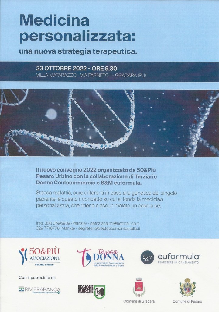 50&Più Pesaro Urbino, sempre all’avanguardia per quanto riguarda la divulgazione medico-scientifica, in particolare relativamente alla Terza età, organizza anche quest’anno un importante convegno, in collaborazione con Terziario Donna ed S&M Euformula, la start up innovativa di Stella Scarpa. Dopo l’interesse riscosso dai precedenti convegni (Fermare il tempo, Medicina di genere, Benessere in menopausa, Andropausa), si parlerà quest’anno di Medicina personalizzata, la nuova sfida della ricerca e della terapia, che prevede trattamenti diversi per la stessa malattia in base alla genetica del singolo paziente. Sede dell’evento una prestigiosa dimora storica immersa nel verde dei colli che si affacciano sull’Adriatico, Villa Matarazzo, a Fanano di Gradara.