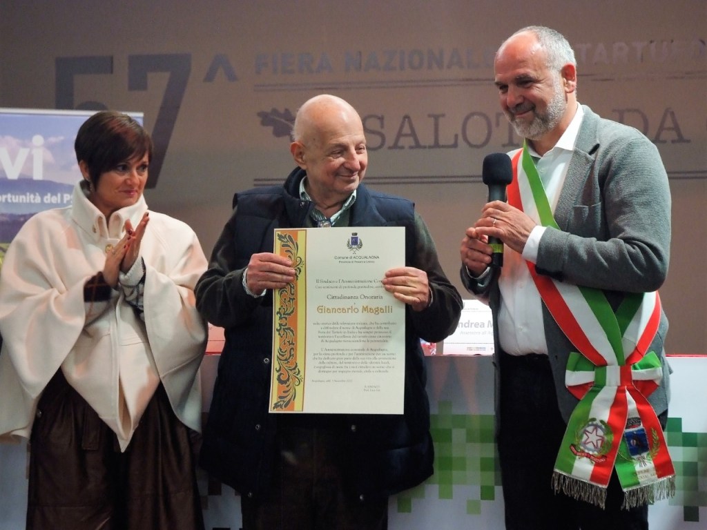 Giancarlo Magalli è cittadino onorario della Capitale del Tartufo Bianco. Cerimonia di consegna oggi, nell’ambito della 57^ Fiera Nazionale del Tartufo Bianco. “Quella con Acqualagna – ha detto orgoglioso Giancarlo Magalli – è una storia d’amore che va avanti da 25 anni. Per me è un onore ricevere la cittadinanza onoraria, che mi fa estremamente piacere. Il mio legame con Acqualagna nasce come un posto dove andare a prendere i tartufi, ma negli anni è diventato il luogo dove stanno i miei amici, un posto del cuore. D’altronde chi conosce Acqualagna e il suo tartufo finisce per innamorarsi. Quest’anno, pur non stando benissimo, sono voluto venire lo stesso”. Magalli sul palco del Salotto da gustare ha, inoltre, condiviso i tanti ricorsi delle sue visite nel corso di venticinque anni ad Acqualagna compreso quando, nel 2013, è stato insignito della Ruscella d’Oro dalla Capitale del Tartufo. Nella consegna, il sindaco Luca Lisi ha dichiarato: “Questa Amministrazione, per la stima profonda che nutre nei confronti di Giancarlo Magalli e per l’ammirazione per un uomo che ha dedicato gran parte della sua vita alla promozione della cultura, del territorio italiano e delle identità locali, è orgogliosa di avere fra i suoi cittadini un uomo che si distingue per impegno morale, civile e culturale”. La cittadinanza onoraria è stata deliberata dalla giunta comunale con questa motivazione “Giancarlo Magalli ha contribuito a diffondere il nome di Acqualagna e della sua Fiera del Tartufo in Italia, sia attraverso i canali televisivi e le trasmissioni di cui è stato autore sia attraverso la propria presenza, ultraventennale in qualità di ospite. Il conduttore, inoltre, nelle sue comparse pubbliche in qualsiasi evento istituzionale, legato alla valorizzazione del Tartufo, ha sempre promosso il territorio e l’eccellenza del tartufo come sinonimo di Acqualagna riconoscendone le potenzialità”.