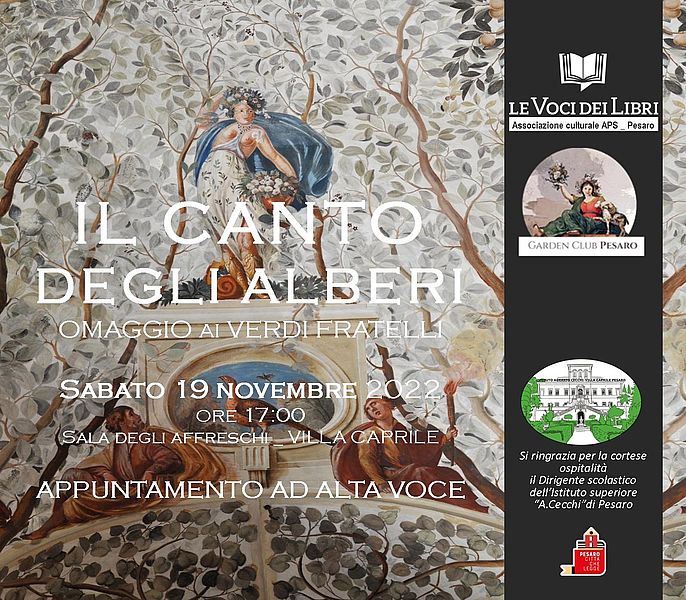 Sabato 19 novembre alle 17:00, il Salone degli Affreschi di Villa Caprile, accoglie il recital ‘Il Canto degli Alberi. Omaggio ai verdi fratelli’ promosso da Le Voci dei Libri e il Garden Club in occasione della Giornata Nazionale degli Alberi (21 novembre).
