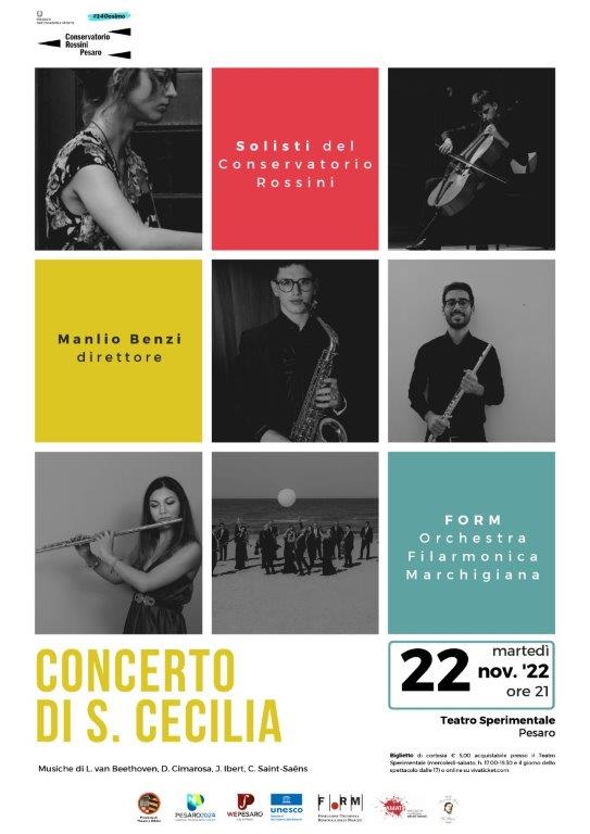 Martedì 22 novembre 2022 (ore 21), la FORM-Orchestra Filarmonica Marchigiana e i solisti del Conservatorio Rossini diretti da Manlio Benzi celebreranno Santa Cecilia nel Teatro Sperimentale di Pesaro.