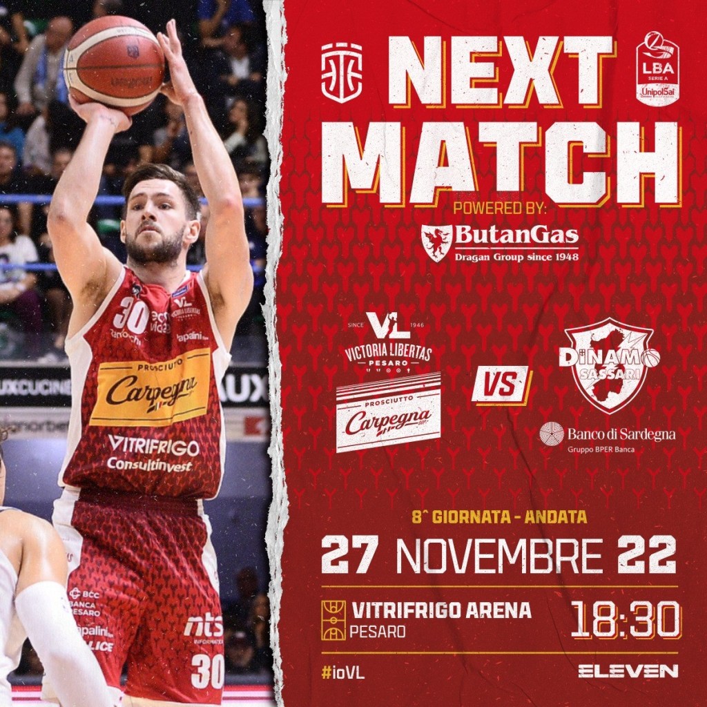 La Carpegna Prosciutto Basket Pesaro comunica che sono acquistabili i biglietti per assistere al match dell‘8^ giornata del campionato di Serie A tra Carpegna Prosciutto Basket Pesaro e Banco di Sardegna Sassari in programma domenica 27 novembre alle 18:30 alla Vitrifrigo Arena.