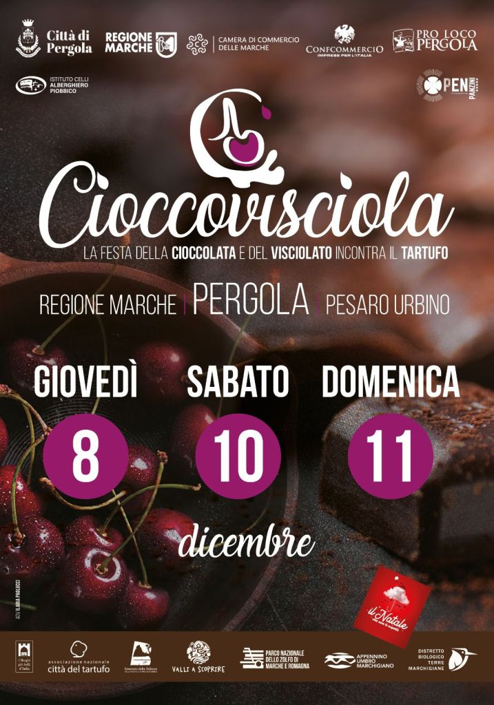 Torna a Pergola l’evento natalizio più dolce: la Cioccovisciola. L’8, 10 e 11 dicembre uno dei Borghi più Belli d’Italia, ospita la festa della cioccolata e del visciolato di Pergola, organizzata dall’amministrazione comunale con la preziosa collaborazione della Pro loco e delle associazioni locali, di Confcommercio Marche Nord, Camera di Commercio delle Marche, Ais Marche.