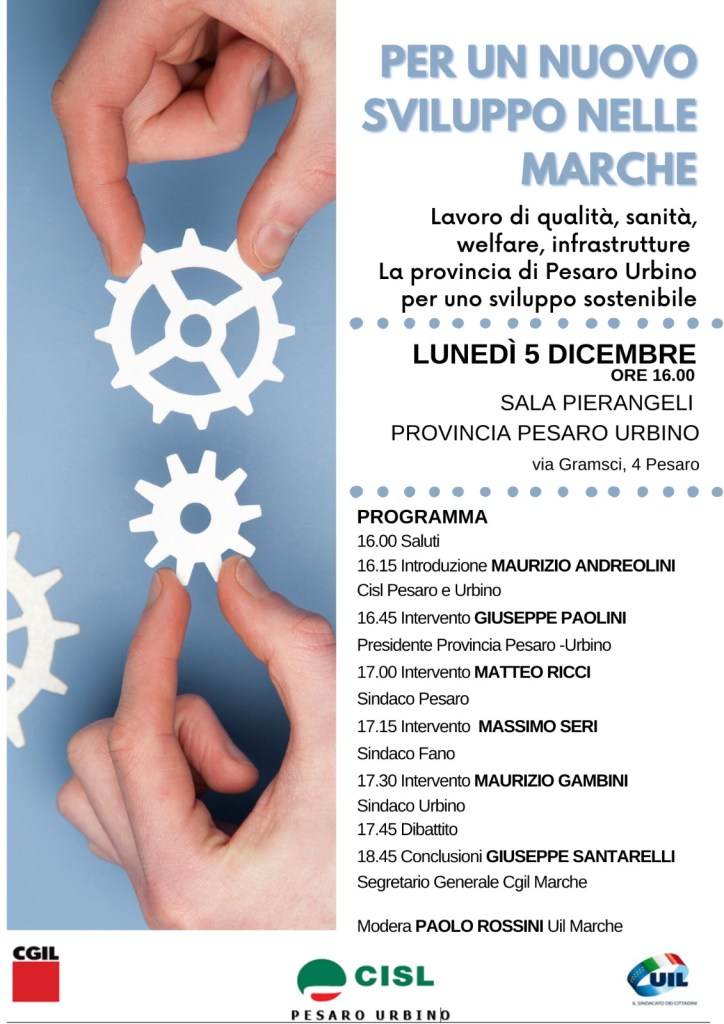 Lunedì 5 dicembre alle ore 16, presso la sala Pierangeli della Provincia di Pesaro Urbino, CGIL CISL UIL organizzano un incontro pubblico per ribadire quali sono le priorità per lo sviluppo economico e sociale.