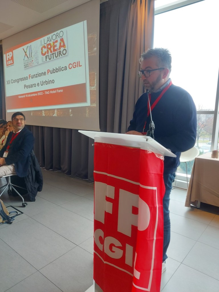 Pesaro – Venerdì 16 dicembre si è svolto il congresso Funzione Pubblica CGIL Pesaro Urbino presso il Tag Hotel di Fano che ha visto riuniti in assemblea tutte le delegate e i delegati eletti nelle assemblee di base che si sono tenute con i lavoratori della funzione pubblica durante questi mesi, nelle quali sono stati presentati i documenti congressuali CGIL. Al termine dei lavori, l’Assemblea generale ha eletto all’unanimità Davide Del Fattore come nuovo segretario generale della funzione pubblica Cgil (nella foto).