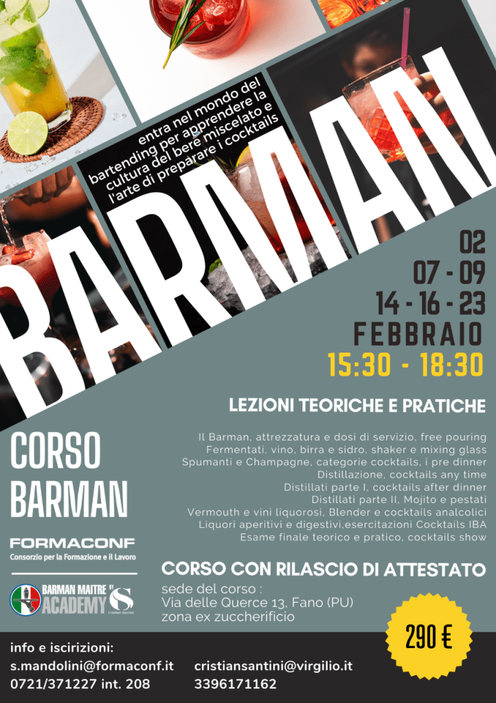 - BARMAN: corso di 18 ore programmazione per FEBBRAIO 2023