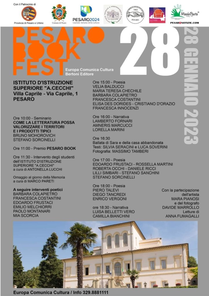 PESARO – La presenza della Bertoni editore, casa editrice con sede a Perugia, a Pesaro è ormai un consueto e piacevole appuntamento. Infatti, ha organizzato in collaborazione con l’Associazione “Europa Comunica Cultura” e con il patrocinio della Provincia e del comune di Pesaro, la prima edizione del Pesaro Book Fest, rassegna letteraria di respiro nazionale con una particolare attenzione agli autori di poesia e narrativa attivi sul territorio pesarese e marchigiano che si tiene il 27 e 28 gennaio e sotto l’egida di Pesaro capitale della Cultura 2024, un ottimo viatico per la letteratura marchigiana.
