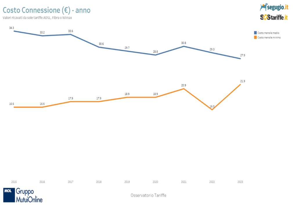 Contemporaneamente, però, si registra una crescita sostanziale del costo mensile minimo e, quindi, del margine di risparmio per i consumatori che scelgono l’offerta più vantaggiosa per la connessione Internet casa (considerando qualsiasi tecnologia disponibile). Il valore registrato ad inizio 2023 è di 21,90 euro al mese, un dato più alto anche del precedente massimo (20,90 euro al mese) registrato nel 2021.