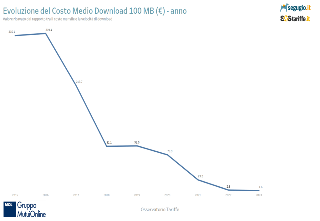 La diffusione della fibra ottica FTTH gioca un ruolo determinante nella drastica riduzione (-98% nel passaggio dal 2020 al 2023) dell’indice “Costo Medio Download 100 MB” ovvero il valore ricavato tra il rapporto tra il costo mensile di un’offerta e la velocità di download nominale garantita dall’operatore che la propone. Questo dato è in costante calo, grazie alla diffusione delle offerte fibra, ed è passato da 73,9 ad appena 1,6 nel confronto tra 2020 e 2023.