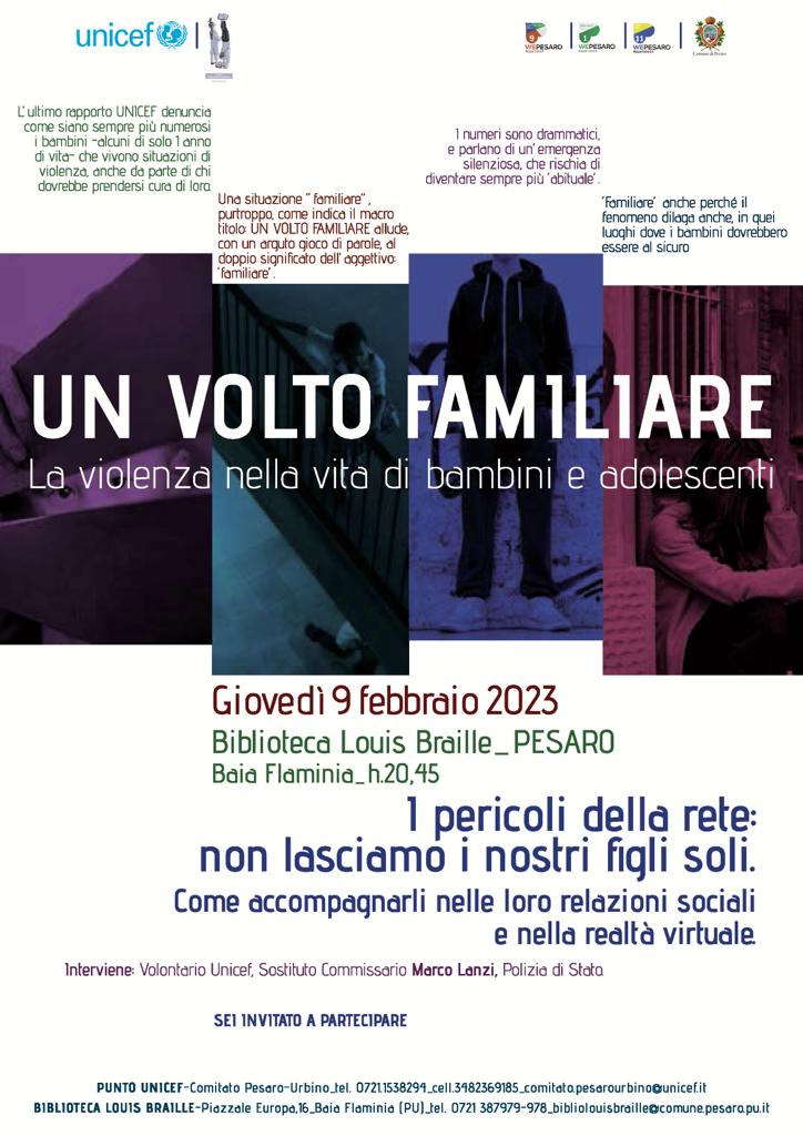 S’intitola “I pericoli della rete: non lasciamo i nostri figli soli. Come accompagnarli nelle loro relazioni sociali e nella realtà virtuale” l’appuntamento in programma giovedì 9 febbraio, ore 20:45 alla biblioteca Louis Braille di Baia Flaminia, promosso dal Comitato provinciale Unicef Pesaro e Urbino e dal Siulp di Pesaro della Polizia di Stato, in collaborazione con il Comune di Pesaro.