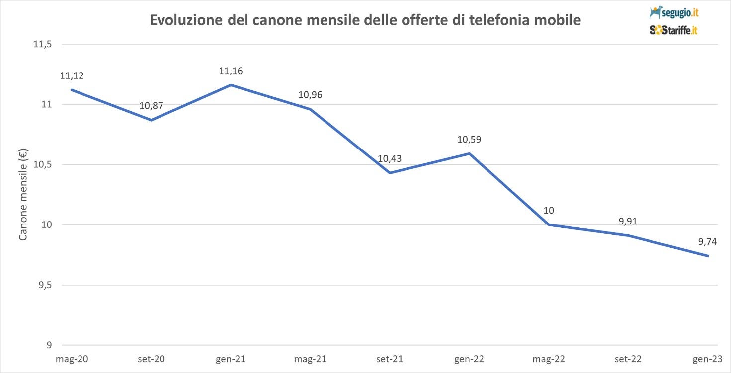 L’indagine conferma prezzi in leggero calo ed offerte sempre più ricche di Giga. Considerando tutte le tariffe mobile presenti sul mercato (sia quelle degli operatori MNO con infrastruttura di rete proprietaria che quella degli operatori virtuali MVNO), si registra un canone medio di 9,74 euro al mese con un calo del -8% rispetto a quanto registrato a gennaio 2022 quando il canone medio era di 10,59 euro al mese. Il dato relativo a gennaio 2023 è particolarmente interessante. Viene confermato il dato dello scorso settembre, con un prezzo medio inferiore ai 10 euro mensili con il dato di gennaio 2023 che rappresenta un nuovo minimo per il settore.