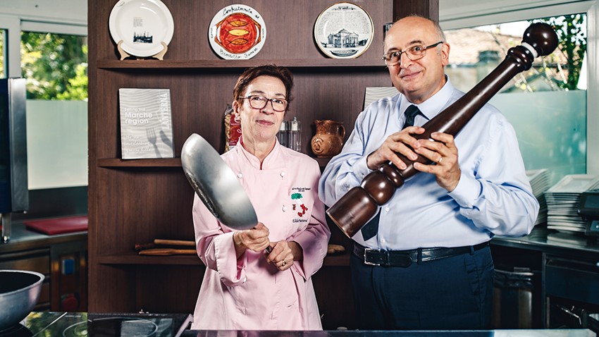 “E’ la nostra filosofia di sempre a guidarci – dice il patron Flavio Cerioni – che recita ‘Il mare con i piedi nell’erba’. Lo abbiamo scritto in grande anche sulla parete esterna del ristorante, perché chi entra qui trova sempre prodotti in gran parte del pescato della marineria fanese uniti ai prodotti dell’orto, sempre coniugando il buon cibo con l’attenzione all’ambiente, alla tradizione fanese che ha un’anima di mare Adriatico. Questo menu rappresenta una sintesi perfetta, che si chiude con un dolce tipico rustico delle aree interne, il Bostrengo”.
