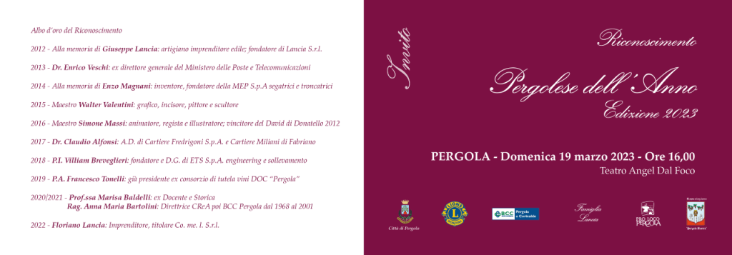 Domenica 19 marzo 2023, a Pergola, al Teatro Angel Dal Foco, alle 16, verrà assegnato il riconoscimento Pergolese dell’Anno, edizione 2023.