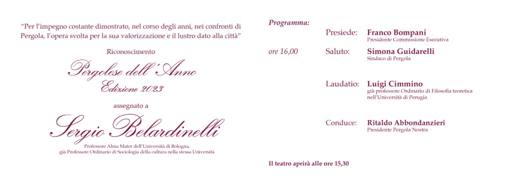 Nel pomeriggio, dopo i saluti istituzionali del Sindaco di Pergola Simona Guidarelli e dei rappresentanti delle associazioni e degli enti promotori, il Presidente della Commissione esecutiva dott. Franco Bompani illustrerà le motivazioni del premio. La cerimonia sarà condotta da Ritaldo Abbondanzieri, presidente di Pergola Nostra. La Laudatio sarà tenuta dal Prof. Luigi Cimmino, già professore Ordinario di Filosofia teoretica nell’Università di Perugia.