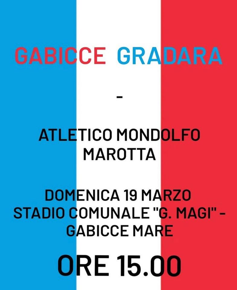 Dopo aver osservato il turno di riposo, il Gabicce Gradara ritorna in campo domenica ospitando al Magi il Mondolfo Marotta. Per le vittorie di Moie, Sant’Orso e Fermignanese nell’ultima giornata, la squadra di Vergoni è scivolata all’ottavo posto appaiata proprio al Mondolfo Marotta (34 punti), squadra che nelle ultime cinque partite ha collezionato solo un punto e che avrà la importante defezione dell’attaccante Cordella (squalificato).