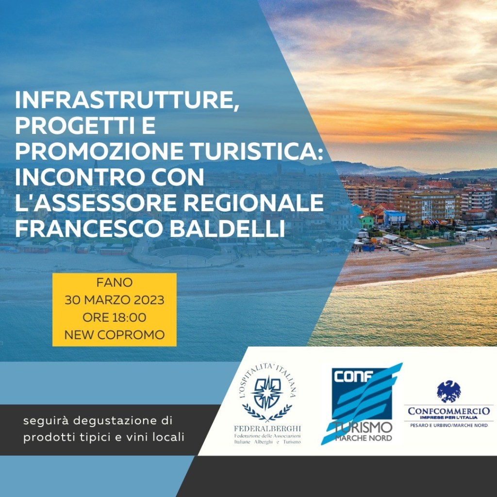 Le infrastrutture come precondizione di sviluppo economico, turistico e sociale è l’importante ed attuale tema al centro dell’incontro in programma domani (giovedì 30 marzo) alle ore 18 a Fano, presso New Copromo. A parlarne, invitato da Confcommercio Marche Nord, Confturismo e Federalberghi, con particolare attenzione alla città della Fortuna e alla provincia di Pesaro Urbino, sarà l’assessore regionale alle infrastrutture Francesco Baldelli.