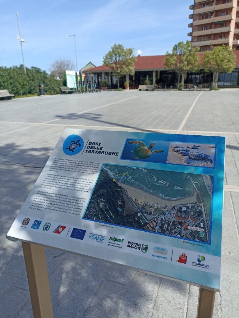 Protagonista del progetto anche la Biblioteca Louis Braille collegata all’Oasi da una piacevole passeggiata da fare a piedi o in bicicletta, che diventa ora centro di documentazione sulle tartarughe marine. A questo serve la Sala del Viaggiatore – novità che piacerà tanto ai bambini -, una stanza ‘speciale’ creata per l’occasione dove trovare guide e romanzi di viaggio, libri sulla natura e su questa parte d’Italia oltre che strumenti multimediali accessibili anche ai più piccoli con disabilità, in coerenza con la mission della Braille da sempre vocata all’inclusione. L’intervento di riqualificazione generale dell’area che circonda la biblioteca è stato pensato per dare forma visiva all’itinerario che la collega alla caletta di Lido Pavarotti ma anche per migliorare la funzionalità della Braille durante tutto l’anno dotandola di postazioni all’aperto ideali per l’estate. Il nuovo arredo urbano prevede una serie di elementi caratterizzati da coerenza di stile, materiali e cromatismi: il gazebo esterno in legno con pedana dotato di un velario e di illuminazione è perfetto per accogliere iniziative open air, un totem informativo retroilluminato e due leggìi (uno in piazza Europa e uno in spiaggia) segnano il cammino dalla piazza al Lido Pavarotti; e ancora, diverse segnaletiche adesive all’interno e all’esterno dell’edificio e due tende in pvc garzato che riproducono il logo della biblioteca a impreziosire la porta d’ingresso. Tra le attrezzature ora presenti, anche una tenda pneumatica a 3 arti utilizzata per i laboratori ‘sostenibili’ con le scuole, allestita in piazza Europa nel periodo invernale e in spiaggia da maggio a settembre. Per la divulgazione del progetto, sono stati messi a punto anche dei materiali di promozione. Coordinato dall’architetto Piero Cantani/Servizio Opere Pubbliche del Comune di Pesaro, l’intervento ha comportato un costo totale di 114.000 euro di cui 79.000 dal contributo di FLAG Marche Nord e i restanti 35.000 dell’amministrazione comunale.