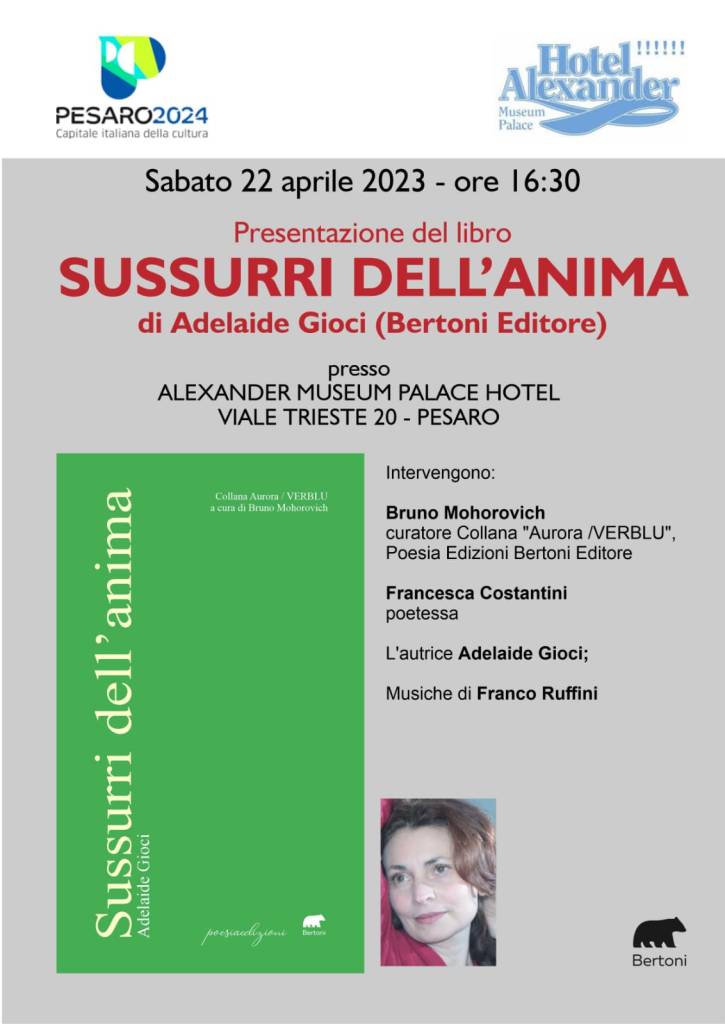 PESARO – Sabato 22 aprile presso i locali dell’Alexander Museum Palace Hotel in viale Trieste a Pesaro, alle ore 16:30 sarà presentato il libro di poesie “Sussurri dell’anima”, debutto nella scrittura poetica di Adelaide Gioci.
