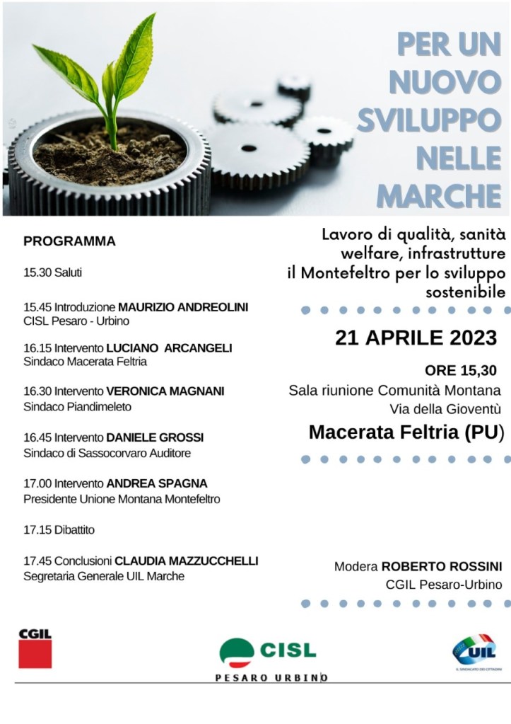 Venerdì 21 aprile alle ore 15.30, presso la sala riunioni della Comunità Montana a Macerata Feltria, CGIL CISL UIL organizzano un incontro pubblico per ribadire quali sono le priorità per lo sviluppo economico e sociale della nostra provincia con un’attenzione particolare sul Montefeltro.