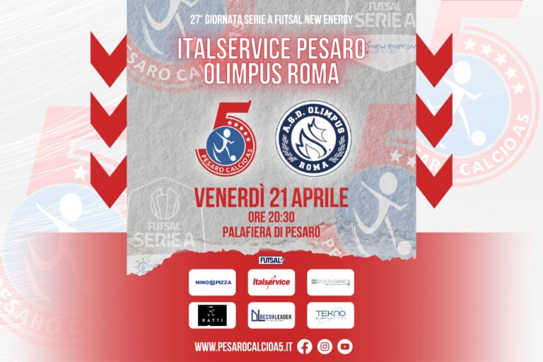 Se i capitolini occupano la terza piazza della graduatoria, l’Italservice deve invece rincorrere la salvezza in questo rush finale di campionato. Pesaro (30 punti) ad oggi giocherebbe il playout con il Monastir (26). La zona salvezza diretta dista quattro lunghezze, con l’Italservice che può fare la corsa sul Real San Giuseppe e sul Ciampino Aniene, entrambe a quota 34. Il presidente Lorenzo Pizza parla così a poche ore dal big match con l’Olimpus: “Siamo dentro la volata finale e c’è una salvezza da conquistare. Abbiamo le carte in regola per conquistarla, nonostante sia stata una stagione tosta, per via dei tanti infortuni che hanno colpito il nostro organico. Salvarsi è importante, ma per sdrammatizzare penso che non dobbiamo farne una malattia. Siamo consapevoli dei nostri mezzi e faremo di tutto per restare in Serie A”.