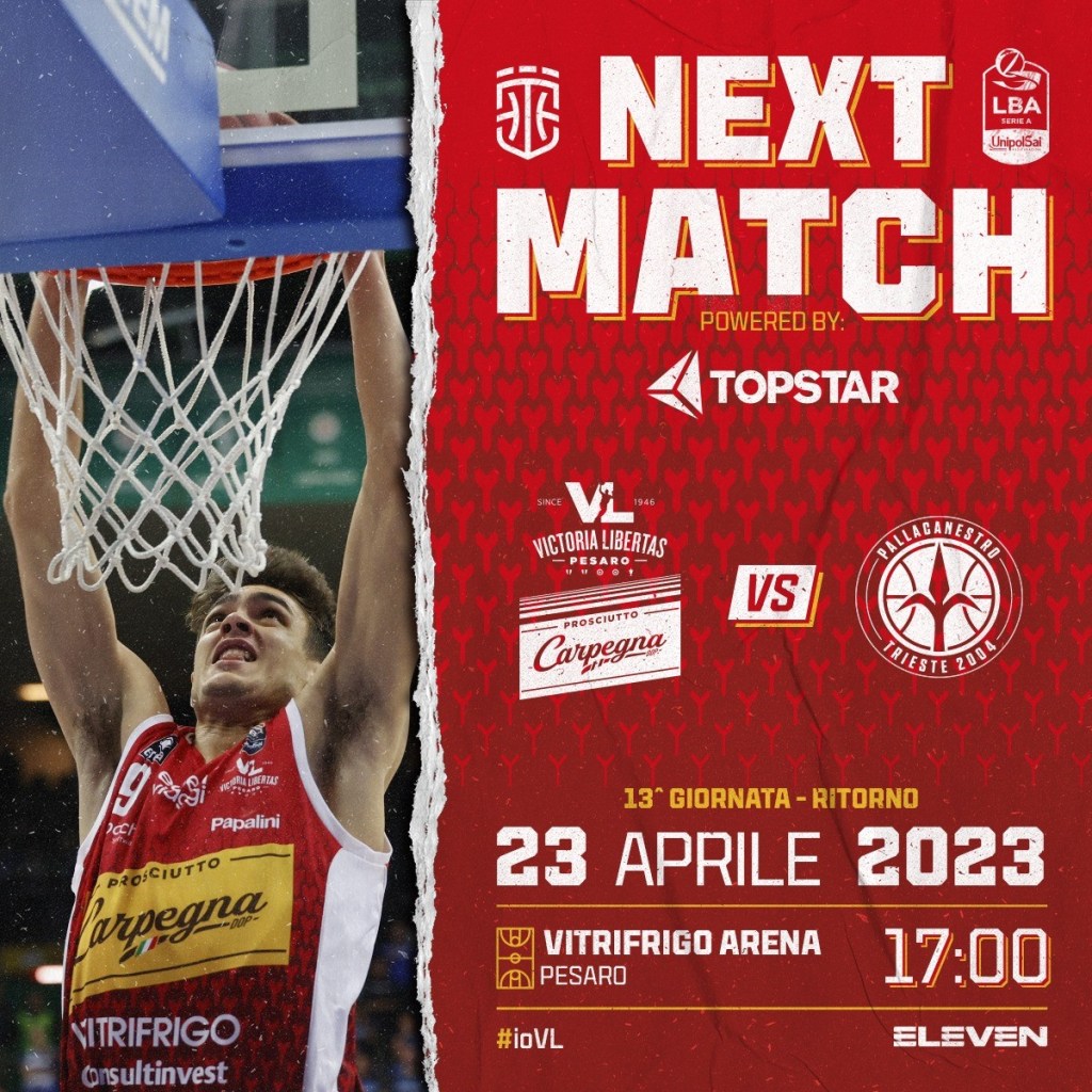 La Carpegna Prosciutto Basket Pesaro comunica che sono acquistabili i biglietti per assistere al match della 28^ giornata del campionato di Serie A tra i biancorossi e la Pallacanestro Trieste in programma domenica 23 aprile alle 17:00 alla Vitrifrigo Arena.