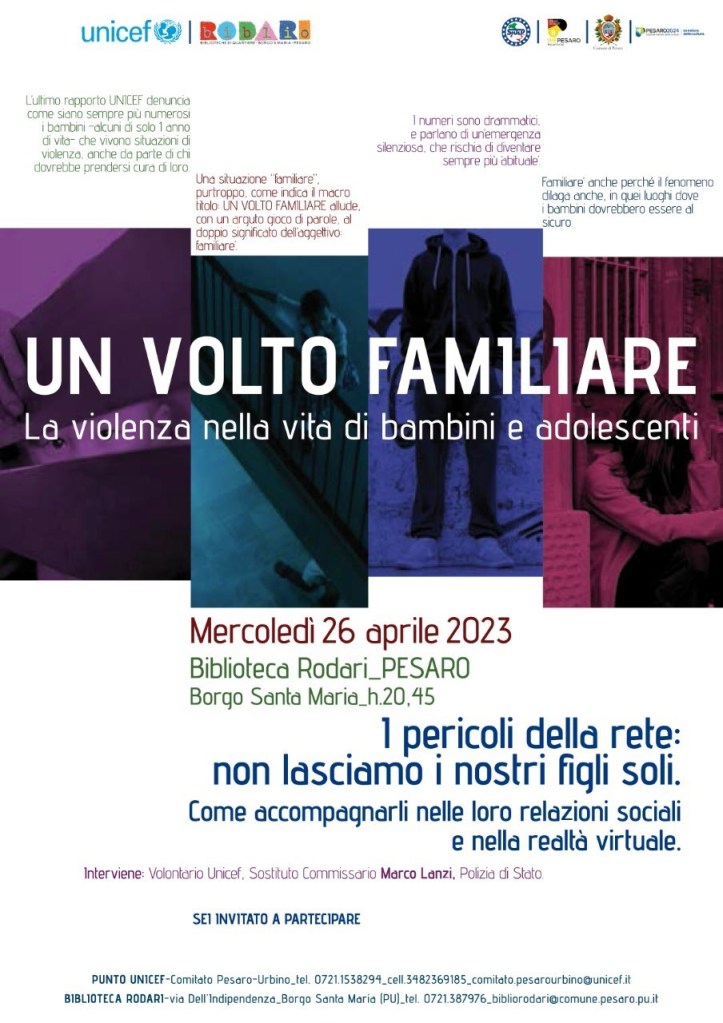 Mercoledì 26 aprile alle 20.45 la Biblioteca Rodari di Borgo Santa Maria accoglie un nuovo appuntamento della rassegna ‘Un volto familiare. La violenza nella vita di bambini e adolescenti” promossa dal Comitato provinciale UNICEF e dal SIULP (Sindacato Italiano Unitario Lavoratori Polizia) di Pesaro, in collaborazione con il Comune di Pesaro, un’iniziativa preziosa che si rivolge soprattutto ai genitori dei ragazzi di età compresa tra i 10 e i 14 anni.