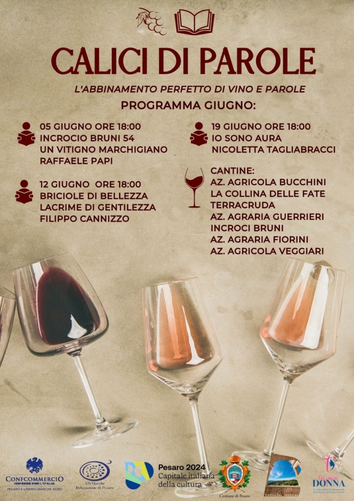 Calici di Parole è la nuova iniziativa di promozione culturale ed enogastronomica che Confcommercio Marche Nord organizza con la collaborazione all’AIS (Associazione Italiana Sommelier) delegazione di Pesaro. Ha il supporto del gruppo Terziario Donna e il patrocinio del Comune di Pesaro per Pesaro Capitale della Cultura 2024.