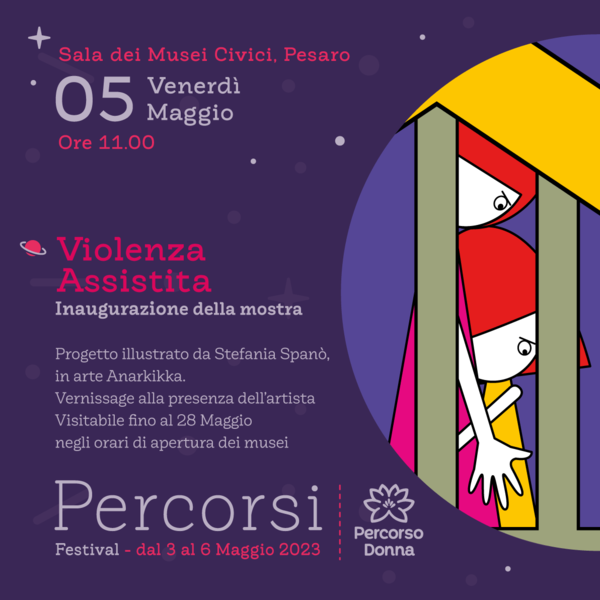 Venerdì 5 maggio alle 11 nella sala polivalente dei Musei Civici inaugura la mostra Violenza assistita, progetto illustrato di Stefania Spanò – in arte Anarkikka – che affronta il tema della violenza assistita intrafamiliare e fa parte del calendario del Festival Percorsi.