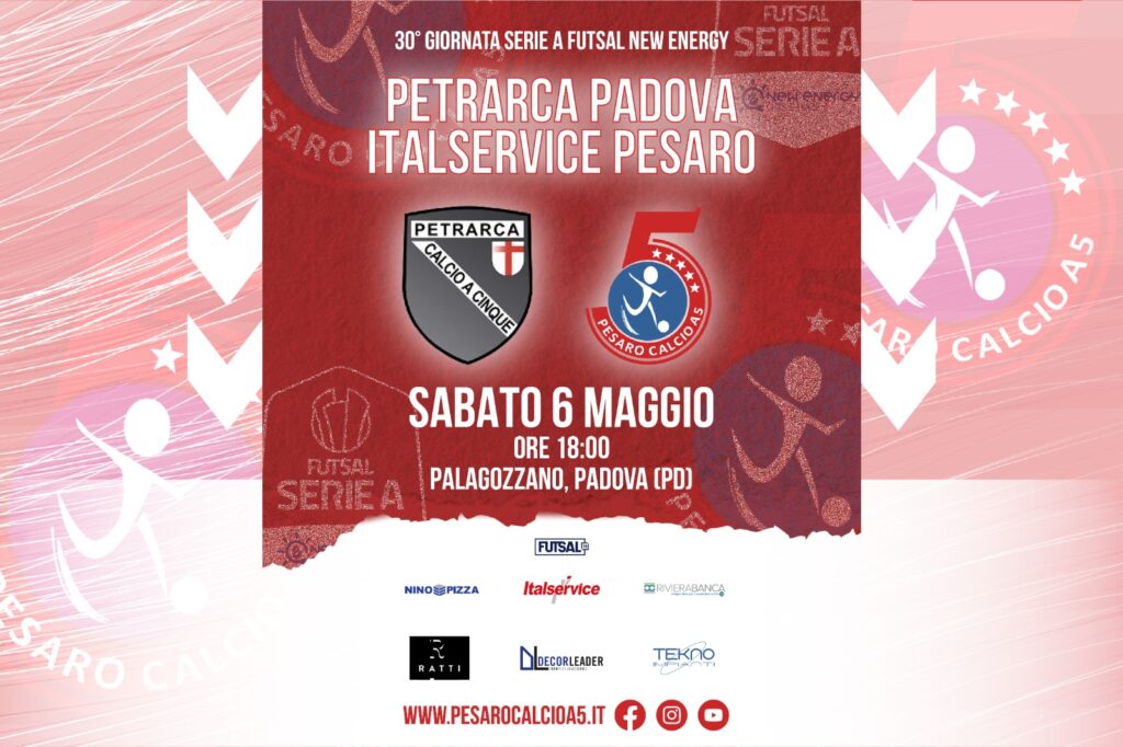 PESARO – Vincere significa salvarsi, pareggiare vuol dire buttare un occhio su un altro campo, perdere equivale alla parola playout. L’Italservice Pesaro si prepara all’ultima giornata di regular season, si gioca sabato al PalaGozzano di Padova. Fischio d’inizio previsto alle ore 18, l’avversario risponde al nome del Petrarca. Gara visibile su futsaltv.it, tranne che per i fantastici tifosi biancorossi che partiranno in pullman per sostenere dal vivo i loro campioni, speriamo per l’ultima volta di questa stagione.