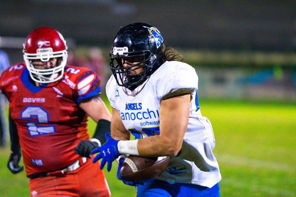 Gli Angels sbancano il campo dei Doves Bologna (28-14) e tengono nel mirino il primo posto nel girone, che contenderanno ai Legio XIII Roma nell’ultima giornata di regular-season, il 28 maggio a Pesaro. Dopo un inizio di studio reciproco, gli Angels vanno a segno con un bel lancio per Jerry Frazzetto. Un touch down bissato poco dopo da Alberto Abbondanza, anche lui innescato molto bene dal qb Aguzzi. Primo tempo tranquillo, quindi, coi pesaresi che vanno al riposo sul 14-0 e la partita che sembra in pugno. Ma nel terzo quarto c’è un capovolgimento di fronte: “I nostri ragazzi hanno iniziato ad accusare la stanchezza – racconta coach Angeloni – alcuni erano impegnati nel doppio ruolo, sia in attacco che in difesa ed è molto dispendioso a livello di energie. Così i Doves hanno alzato la testa e sono riusciti a segnare, accorciando le distanze. Poi nell’ultimo quarto è successo di tutto”.