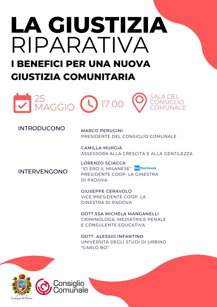«Affrontiamo questo tema con ospiti illustri, alla luce della “riforma Cartabia” che assegna agli enti locali la responsabilità di istituire e vigilare sul funzionamento dei Centri per la giustizia riparativa. Il convegno di giovedì, sarà un ottimo strumento di analisi e comprensione della materia e dei recenti aggiornamenti normativi, anche in vista del centro destinato a questa finalità, che il Comune di Pesaro, in collaborazione con la Prefettura, ha previsto di realizzare nel territorio» spiegano Marco Perugini, presidente del Consiglio comunale e Camilla Murgia, assessora alla Crescita e alla Gentilezza, promotori dell’iniziativa. «Sarà un pomeriggio aperto alla città e rivolto, in particolare, agli operatori del settore per coinvolgere la comunità in un percorso che guardi a nuove prospettive e metodologie di giustizia» aggiungono.