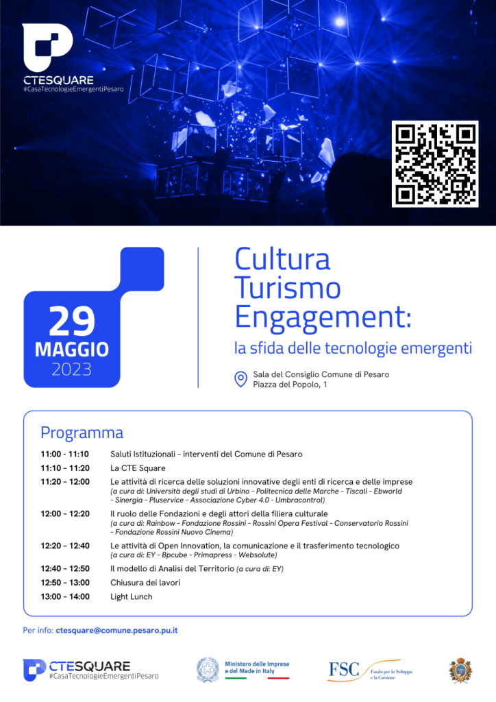 Il «laboratorio tecnologico» “Pesaro CTE Square” dà appuntamento al pubblico lunedì 29 maggio, alle 11, nella sala del Consiglio comunale (2° piano del Municipio in piazza del Popolo 1) con “Cultura, turismo, engagement: la sfida delle tecnologie emergenti”, mattinata di lavoro della CTE Square, «aperta a cittadini, associazioni di categoria, ordini professionali, attività economiche e realtà coinvolte in questo progetto che creerà a Pesaro un centro innovativo sulle tecnologie emergenti nei settori strategici per il territorio» spiega Francesca Frenquellucci, assessora all’Innovazione e alla Partecipazione.