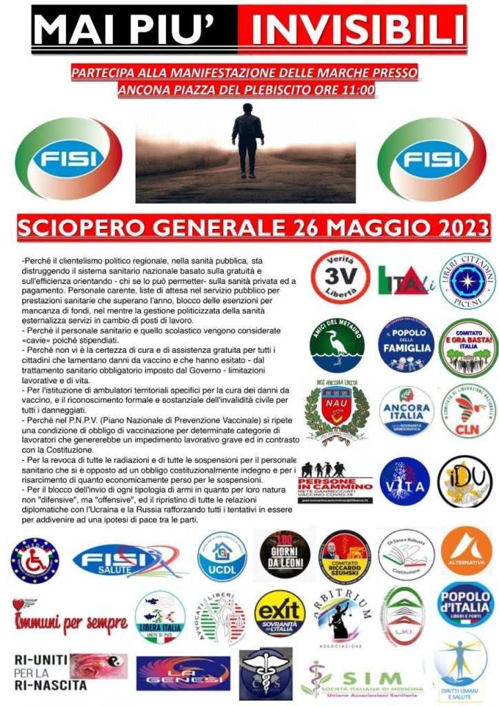 Il 26 maggio 2023, in occasione dello sciopero generale, decine di associazioni e di movimenti politici saranno presenti in manifestazione presso le Prefetture di ogni regione insieme alla FISI (Federazione Italiana Sindacati Intercategoriali) per testimoniare lo stato di totale degrado della sanità italiana, per manifestare a favore della inviolabilità del diritto individuale di scelta e di cura, contro ogni obbligo sanitario , a favore del personale sanitario sospeso e radiato, contro ogni guerra e contro l’entrata (nei fatti) dell’Italia nella guerra tra Ucraina e Russia.