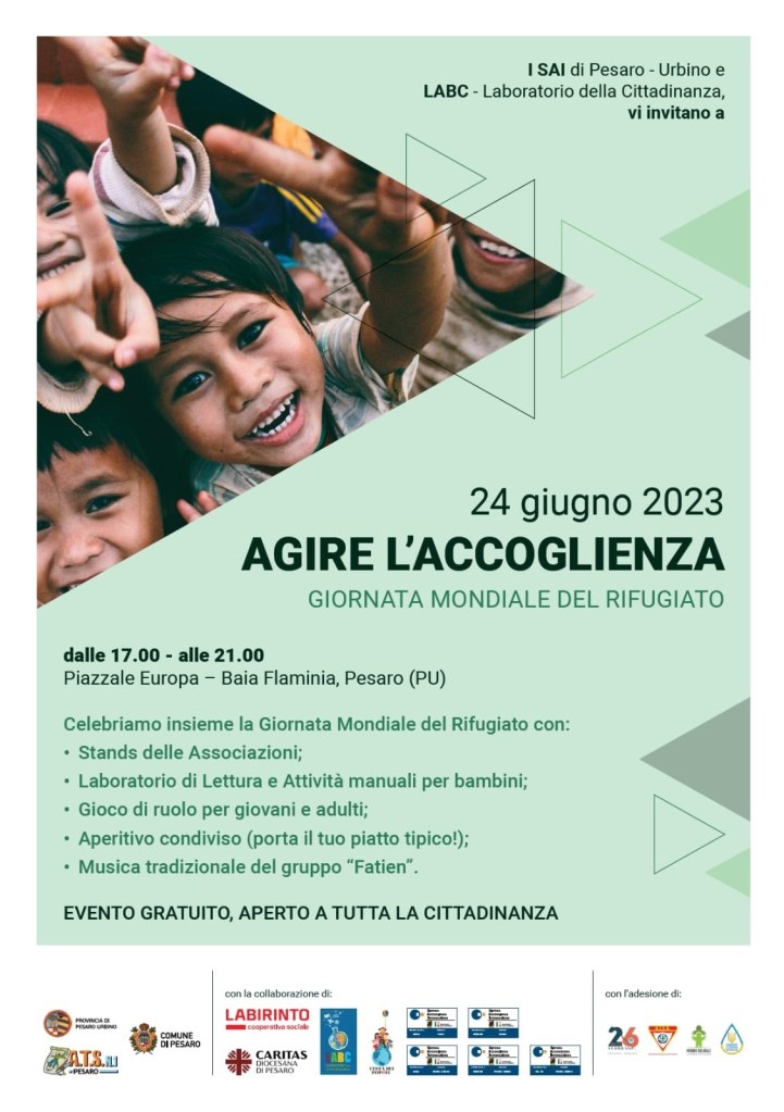 Pesaro onora e festeggia la Giornata mondiale del Rifugiato, indetta dalle Nazioni Unite per commemorare la Convenzione relativa allo status dei rifugiati. Per l’occasione, i progetti SAI (Sistema Accoglienza Integrazione) di Pesaro e Urbino e il LABC – Laboratorio della Cittadinanza dell’Ats1, insieme a Festa dei Popoli ODV, Caritas Pesaro e Labirinto Coop. Sociale organizzano, sabato 24 giugno, dalle 17 alle 21, in piazzale Europa (Baia Flaminia) “Agire l’accoglienza”. Una manifestazione (ingresso gratuito) promossa per «tenere alta l’attenzione sul tema delle migrazioni e sensibilizzare la cittadinanza sui temi dell’accoglienza e del rispetto dei diritti di ogni individuo soprattutto considerati i numeri record di quest’anno: 110milioni di rifugiati nel mondo di cui il 41% bambini; 355.000 in Italia di cui quasi la metà ucraini» ha sottolineato Luca Pandolfi, assessore alla Solidarietà e presidente del comitato dei sindaci dell’Ats1.