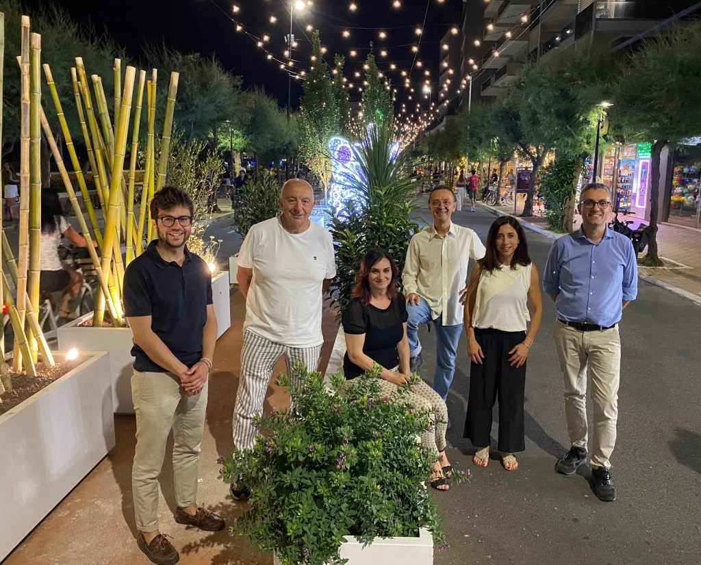 Presentato l’allestimento che caratterizzerà la stagione e la passeggiata del lungomare Il cielo stellato di viale Trieste illumina “l’estate da Capitale” di Pesaro C’è un “cielo stellato” a guidare la passeggiata sempre più verde, luminosa e spaziosa del lungomare di Pesaro. La città si veste a tema per accogliere al meglio pesaresi e turisti in arrivo per questa “estate da Capitale” bandendo le auto dalla carreggiata del lato nord di viale Trieste e sostituendole con sedute bianche, fioriere con piante tropicali alternate a canne di bambù, arredi bianchi dalle forme allungate e istallazioni luminose di campanule e farfalle a giocare con i totem della “La Natura della Cultura” di Pesaro2024, Capitale italiana della cultura. «Più verde, più spazi: questi i due cardini del progetto di allestimento della parte nord di viale Trieste – spiegano il sindaco Matteo Ricci, l’assessore al Fare Riccardo Pozzi e l’assessore all’Operatività Enzo Belloni –. Un’area che, come Amministrazione, abbiamo “liberato” dalle auto da 3 anni, nella prima estate della pandemia per dare “respiro” alle attività economiche e ai visitatori». E se all’inizio ci sono state alcune resistenze, oggi sono gli stessi titolari di locali del viale a chiedere di proseguire nella pedonalizzazione della carreggiata e nell’istallazione di allestimenti, sempre più amati da pesaresi e turisti pronti a scattare selfie e foto di gruppo per immortalare la loro “estate da Capitale”». L’istituzione di Apu (Area pedonale urbana) in viale Trieste (insieme alle altre modifiche alla viabilità valide fino al 3 settembre),«S’inserisce nella più generale riprogettazione dell’intero waterfront, che comprende anche la rigenerazione di piazzale D’Annunzio – aggiunge Pozzi -, i cui lavori si concluderanno i primi giorni di luglio, allungando la passeggiata nella parte sud del viale e creando una nuova piazza per la città». Comune di Pesaro Nella foto, da sinistra: Riccardo Pozzi (assessore), Enzo Belloni (assessore), Maria Rosa Conti (assessora), Andrea Tartaglia (presidente Q11), Mila Della Dora (assessora), Paolo Costantini (APA Hotels) |