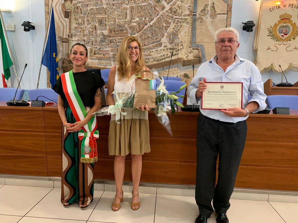 Guendalina Blasi, presidente della Commissione, ha aggiunto che, a Tomasucci, «Va un giusto riconoscimento ad una donna che si è spesa professionalmente ed umanamente per attivare quei processi civici di cambiamento sociale, in modo particolare verso la conquista delle pari opportunità e della difesa dei diritti delle donne, temi questi particolarmente cari anche a Maria Pia, con la quale ha condiviso a lungo progetti e pensiero». A ritirare il Premio è stata la figlia Raffaella Balestrini, a nome del fratello Tiziano, del padre e marito di Alfonsina Gastone Balestrini e dei nipoti, presenti in sala insieme al fratello Roberto Tomasucci. «Ringraziamo il Consiglio comunale, il Sindaco, l’assessora e la Commissione che ha valutato le caratteristiche di mia madre – ha detto Balestrini -, un’insegnante, una femminista convinta. Questo riconoscimento onora la sua memoria e riconosce il percorso da lei fatto nella sua Pesaro. È un premio, inoltre, che viene dalle donne: non poteva quindi che essere quello giusto per mia madre».