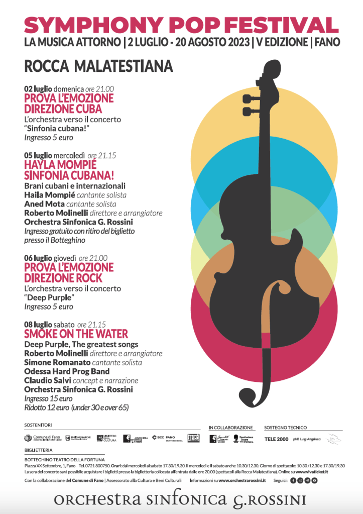 Fano, 28/06/2023 – Annunciate alla Rocca Malatestiana di Fano a inizio giugno dall’Assessore alla Cultura del Comune di Fano, Cora Fattori, e dal Presidente e Sovrintendente dell’Orchestra Sinfonica G. Rossini, Saul Salucci, arrivano finalmente le serate in musica con l’Orchestra Sinfonica G. Rossini: la prima parte del cartellone del Symphony Pop Festival 2023 (V edizione) sarà interamente ospitata nel giardino della Rocca fanese, dove il 05 luglio sbarcheranno i ritmi cubani mentre l’8 luglio sarà la volta del rock dei Deep Purple.