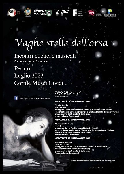 Secondo appuntamento estivo per la decima edizione di Vaghe stelle dell’orsa, la rassegna poetica e musicale dedicata alla poesia italiana e straniera ideata dalla poetessa pesarese Laura Corraducci e organizzata dall’Associazione “Amici della Prosa”, all’insegna della felice mescolanza di prosa e poesia. La manifestazione è sostenuta dall’Assessorato alla Bellezza del Comune di Pesaro in collaborazione con la Biblioteca “Bobbato”, e negli anni ha portato a Pesaro oltre settanta tra i più importanti poeti italiani e stranieri.