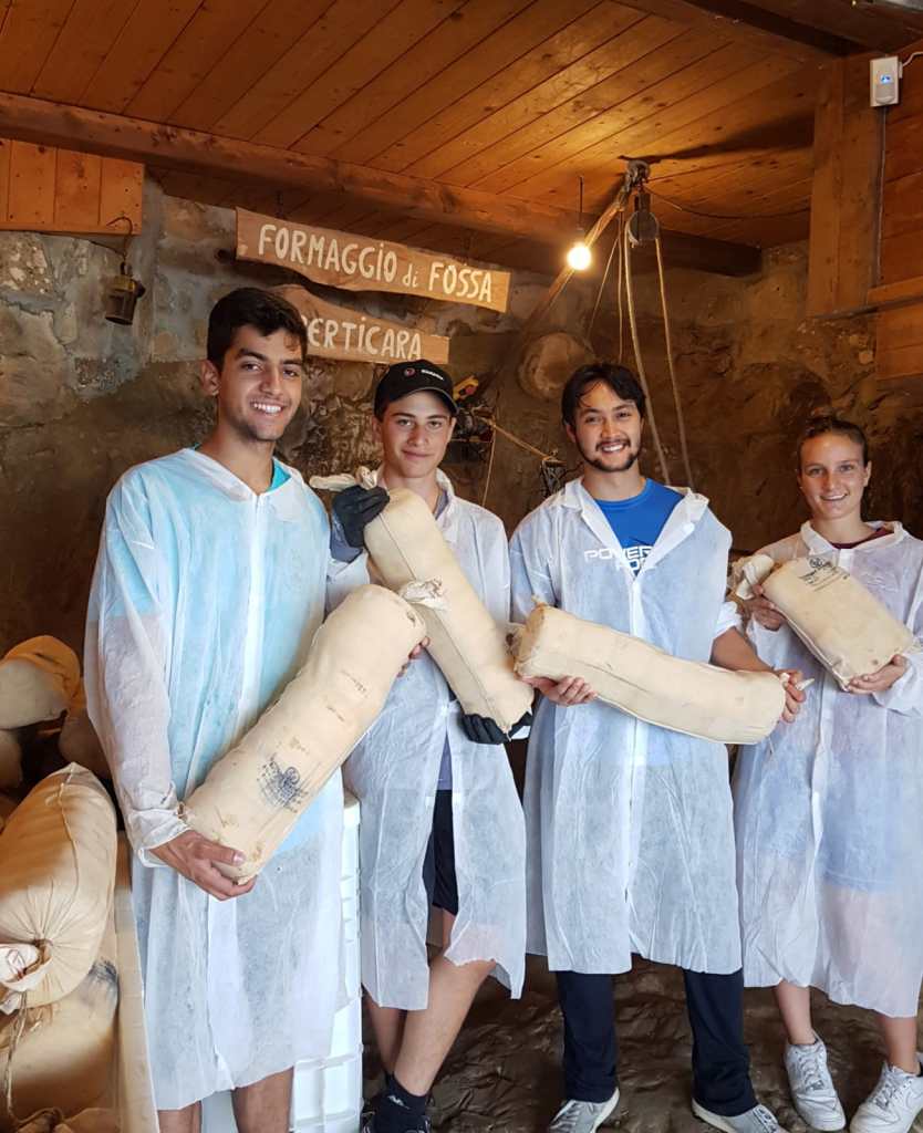 Nella foto da sinistra: Davide Draghi, Mio Carlini, Gianluca Fabbri, Eleonora Micheli. Studenti dell’Istituto Agrario villa Caprile di Pesaro in stage presso la cooperativa agricola Altavalmarecchia-Montefeltro intenti nell’operazione di sfossatura della DOP Formaggio di Fossa di Sogliano, per conto del gruppo TreValli Cooperlat.
