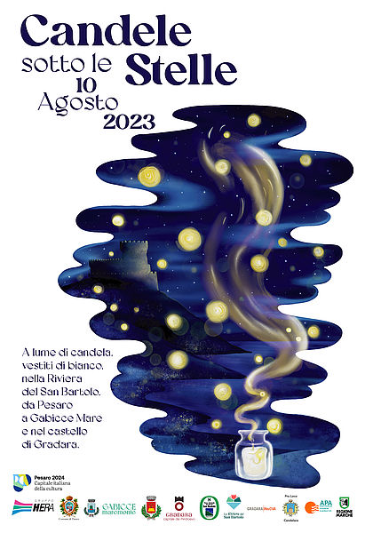 L’immagine 2023 dell’evento, è a cura dell’illustratrice Silvia Peduto. Nel manifesto, sovrastano il mare tante fiammelle che, partendo da una candela, salgono al cielo per rimandare alle stelle che nella notte di San Lorenzo riempiono il cielo, ancor più visibili grazie allo spegnimento dell’illuminazione pubblica. Sullo sfondo, il San Bartolo che ci collega con le spiagge di Gabicce Mare e più in alto il Castello di Gradara.