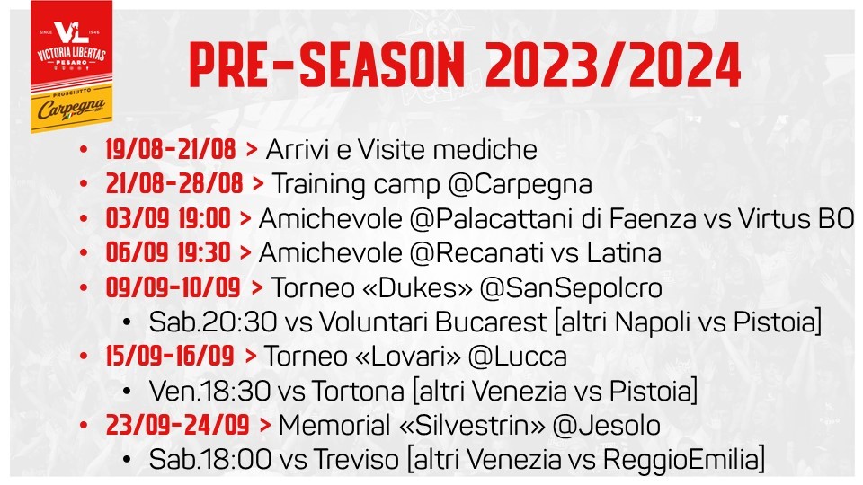 Il primo match di preseason è in programma per domenica 3 settembre alle 19:00 al PalaCattani di Faenza: avversaria sarà la Virtus Segafredo Bologna. Mercoledì 6 settembre alle 19:30 i biancorossi saranno impegnati al PalaCingolani-Pierini di Recanati per l’amichevole contro la Benacquista Assicurazioni Latina. Nel fine settimana del 9 e 10 settembre altre due partite per la Carpegna Prosciutto Basket Pesaro che sarà di scena a Sansepolcro per il Trofeo ‘Dukes’. Sabato 9 alle 20:30 l’avversaria sarà la formazione romena del CSO Voluntari Bucarest mentre domenica 10 alle 18:30 (in base all’esito del match del giorno precedente) una tra GeVi Napoli ed Estra Pistoia.