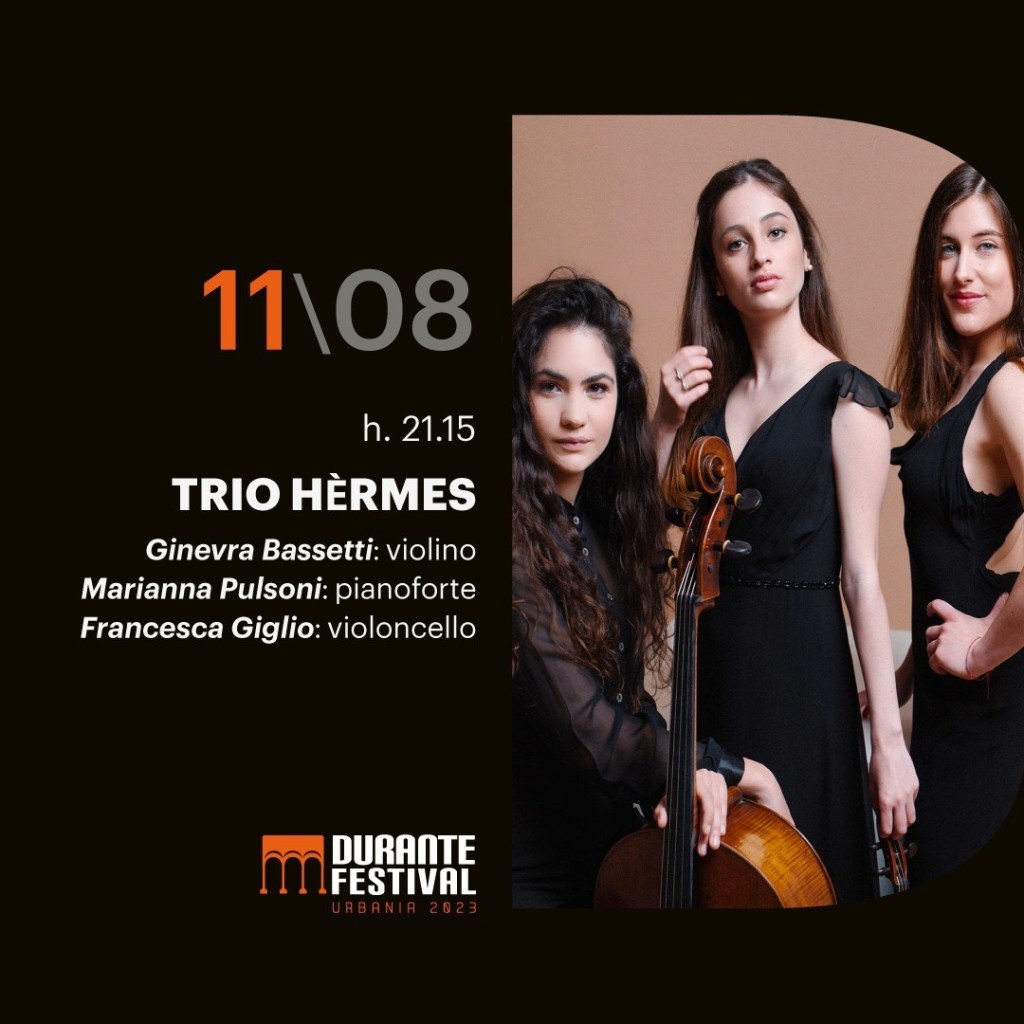Venerdì 11 agosto torna Durante Festival, la rassegna estiva organizzata dal Comune di Urbania e dall’Ente Concerti di Pesaro. L’appuntamento inaugurale (ore 21.15) vedrà protagonista nel suggestivo cortile del Palazzo Ducale di Urbania il Trio Hermes, ensemble al femminile formato dalle musiciste Ginevra Bassetti al violino, Francesca Giglio al violoncello e Marianna Pulsoni al pianoforte, che si è presto imposto all’attenzione del panorama musicale giovanile italiano. Il trio proporrà un programma cameristico che spazierà dal classicismo al romanticismo: dal Trio in mi bemolle maggiore HOB:XV:10 di Franz Joseph Haydn, al “Notturno” D.897 mi bemolle maggiore di Franz Schubert, al Trio n.1 op.63 in re minore di Robert Schumann.